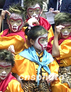 香港時代廣場元月二十七日舉行十周年慶典活動,為隆重其事特安排“甲申猴年金猴鬧獅賀新春”表演,圖為“群猴賀禧”。作者:錢興強
