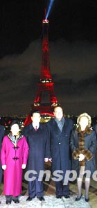 一月二十七日是中法建交四十周年紀念日,中國國家主席胡錦濤伉儷和法國總統希拉克夫婦二十七日晚上在法國巴黎埃菲爾鐵塔前留影紀念,該塔自二十四日晚開始至二十九日凌晨止,為表達法國對中國文化傳統的敬意,而舉行“鐵塔映紅”活動——鐵塔被紅色射燈裝扮成了一座代表中國的“紅塔”。作者:成丁