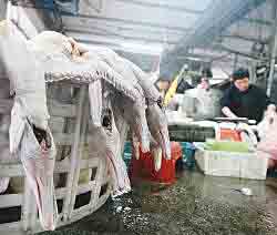 臺北市活禽批發市場雖檢出帶H5N2禽流感病毒的活鴨,29日下午業者仍不以為意,繼續宰殺鴨子販售。(臺灣《聯合報》圖)