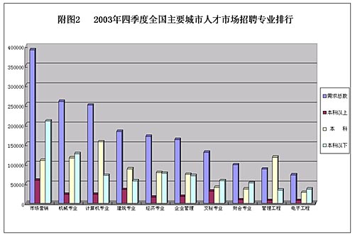 中新網2月4日電 2003年四季度全國人才市場供求信息顯示,全國人才市場人才供需兩旺,但各專業間供求形勢差異較大。市場營銷、機械、計算機、建筑等專業依然是人才市場的熱門專業,職位需求量保持旺盛。