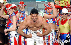 俄羅斯莫斯科馬戲團(tuán)2月5日移師觀塘,全新節(jié)目首次在香港曝光,包括珍貴的白老虎、雜耍藝術(shù)、狗仔足球隊(duì)、艷麗四射的舞蹈等節(jié)目,給觀眾帶來刺激和歡樂。圖為馬戲團(tuán)大力士弗克烈甸與艷麗四射的舞蹈女郎。作者:洪少葵