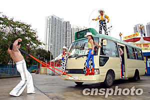 正在香港巡回演出的俄羅斯馬戲團(tuán)2月5日移師觀塘,馬戲團(tuán)大力士弗克烈甸施展神乎奇技的力量,將滿載演員的公共小巴拉入星輝帳篷。作者:洪少葵