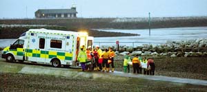 在英格蘭西北部莫克姆灣海灘,救援人員將遇難者尸體抬上一輛救護車。新華社發