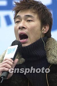 香港歌星梁漢文,二月七日在香港維多利亞公園舉行的“渣打馬拉松2004打氣音樂會”上冒雨為歌迷演唱。中新社記者:錢興強