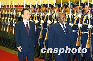 中國國務院總理溫家寶二月九日在北京人民大會堂主持歡迎儀式,歡迎來訪的巴布亞新幾內亞總理索馬雷。中新社記者:毛建軍