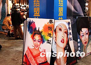十三日,中國影樓、婚紗用品展在北京舉行,一銷售假發的參展商推出美侖美奐的造型圖片吸引商家加盟。中新社記者:王麗南
