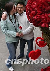 情人節之日,一位北京男士在紅玫瑰花和同心結前喜得女友浪漫的一吻。中新社記者:史利