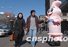 二月十四日是西方“情人節”,一家安全套銷售商在北京西單街頭向青年男女免費派送安全套,許多情侶坦然接受。中新社記者:張煒