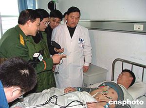 二月十五日十一時(shí)許,吉林市中百商廈發(fā)生火災(zāi)。截至十六日上午,已知有五十三人喪生,另有七十人受傷被送往醫(yī)院接受治療。圖為國(guó)家安全生產(chǎn)監(jiān)督管理局和公安部消防局有關(guān)人員到醫(yī)院看望救火中受傷的消防隊(duì)員。作者:吳兆飛
