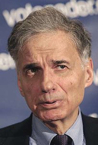 本周即將年滿七十的納德二000年曾經(jīng)以綠黨候選人的身份參與總統(tǒng)大選角逐,雖然僅獲得百分之二點(diǎn)七的選票,但因?yàn)椴际苍诜鹆_里達(dá)和新罕布什爾兩州僅以微弱的優(yōu)勢(shì)壓倒戈?duì)枺〉眠@兩州的選舉人票而登上總統(tǒng)寶座,民主黨人認(rèn)為納德的得票分流了本來支持戈?duì)柕倪x民,導(dǎo)致戈?duì)柭鋽 ?div align="left">