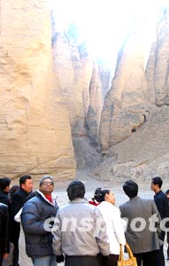 中國國土資源部日前公布,四川九寨溝、甘肅景泰石林等被評為“國家地質公園”。甘肅景泰石林位于甘肅省景泰縣,生成于四百萬年前,由地殼運動、風化、流水侵蝕和重力崩塌形成,其石柱、石筍均由桔黃色砂礫巖構成,大多高達八十至一百米之間,最高達二百多米。圖為聯合國教科文基金水利工程協會的專家前來考察屹立在黃河兩岸的甘肅景泰石林。作者:殷春永
