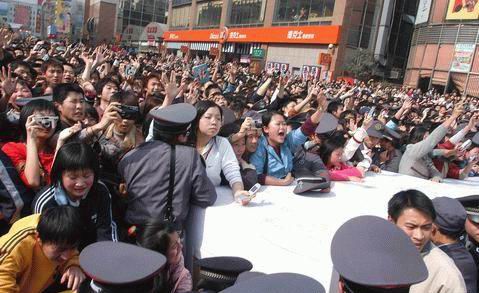 到13時,現場的保安和臨時通知增援的警察增加到了300多名。盡管這樣,好幾名保安在接受記者采訪時仍憂慮地表示,現場的歌迷和好事者已經數度想沖進保安防線,“如果蕭亞軒出現,不知道現場會怎樣!”而就在13時許的時候,歌迷就開始接近瘋狂狀態。在保安線外的歌迷們手拿蕭亞軒的巨幅海報、照片和CD亂舞,有的歌迷根本不認識在場內的記者,仍然執意要把照相機交給記者,請記者為他們近距離拍偶像的照片。在活動區域右側的一群歌迷一直整齊劃一地高喊“Elva(蕭亞軒英文名)”達半小時以上。原本這個區域的保安只有一層,但由于這群歌迷不停地尋找機會沖進場內,現場指揮不得不增加一排保安和一排警察組成三重人墻才控制住場面。