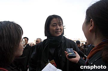 今天的倪萍穿著一身黑衣,低著頭步履匆匆前行,她還不時警惕地向左右看看,企圖躲避記者聚集的地方,眾多記者的目光已被一旁的楊瀾吸引過去,還沒注意到她。但就當(dāng)她快要走到大會堂前的臺階時,被幾個熟識的記者攔住了去路。