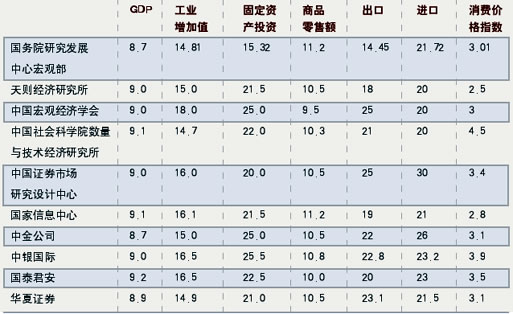 2003年中國全年GDP增長9.1%,達(dá)到1997年以來GDP的最高增速。目前經(jīng)濟(jì)學(xué)界較為一致的看法是,中長期中國經(jīng)濟(jì)仍可保持強(qiáng)勁的增長勢頭,但對于GDP能否保持去年的增速或者超過去年的增速卻有很大分歧。一種觀點(diǎn)認(rèn)為,2003年經(jīng)濟(jì)增長達(dá)到短周期波動(dòng)的波峰,2004年將進(jìn)入短周期波動(dòng)的收縮期,經(jīng)濟(jì)增長速度將出現(xiàn)小幅度下降。另一種觀點(diǎn)認(rèn)為,中國經(jīng)濟(jì)可能突破傳統(tǒng)的周期,2004年GDP增速可能再創(chuàng)新高。而《證券市場周刊》特邀10家機(jī)構(gòu)所作的2004年一季度宏觀經(jīng)濟(jì)預(yù)測也體現(xiàn)了這兩種不同的觀點(diǎn)。