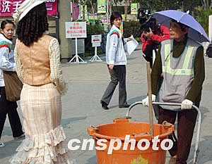 日前,在香港維多利亞公園一位頭戴別致遮陽帽的環保員工,與身穿華麗服飾的港姐迎面而過,兩人不同的服飾顯得各具風采。作者:錢興強