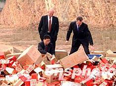 三月十五日,廣東省酒類專賣管理局在廣州從化市舉行大型銷毀假冒偽劣酒類產(chǎn)品現(xiàn)場會,銷毀假冒高檔名酒“水井坊”、“五糧液”、“軒尼斯”、“藍帶”、“金牌馬爹里”等及假冒標識、包裝物,共值約3500萬元。國際洋酒協(xié)會(IFSP)董事長伍國豪(左)先生等到場協(xié)助。作者:鄧嘉樂