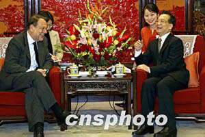 中新社北京三月十六日電 (記者 朱大強(qiáng))中國(guó)總理溫家寶今天在此間會(huì)見了到訪的歐盟理事會(huì)秘書長(zhǎng)兼歐盟共同外交與安全政策高級(jí)代表索拉納。