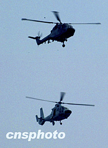 三月十六日,在青島進行的中法聯合軍事演習中,中國海軍112驅逐艦上直升機正在迅速起飛。中新社記者:宋吉河