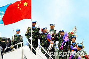 2004年3月16日上午10時(shí)30分,沈陽桃仙國際機(jī)場一架滿載70名維和部隊(duì)先遣隊(duì)官兵的專機(jī)起飛,直飛福州與那里的維和部隊(duì)汽車連會(huì)合共同組隊(duì)經(jīng)法國飛抵利比里亞首都。三月底由沈陽軍區(qū)派遣的維和工程兵部隊(duì)將與先期到達(dá)的先遣隊(duì)會(huì)合,共同完成利比里亞的維和任務(wù)。夫子 攝