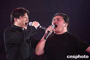 “歡歌2004演唱會(huì)”在座無(wú)虛席的首都體育館隆重上演,中國(guó)內(nèi)地歌手劉歡(右)與特邀嘉賓香港歌手莫華倫一起為到場(chǎng)歌迷獻(xiàn)上了眾多耳熟能詳?shù)母枨W髡?高遠(yuǎn)