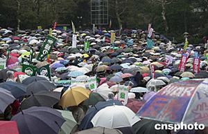 數萬日本民眾三月二十日在東京舉行反戰集會,他們高舉標語牌要求日本自衛隊從伊拉克撤兵。作者:王健