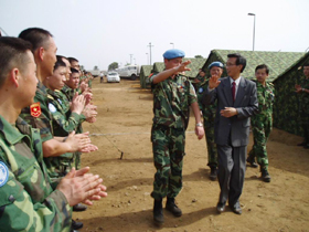 歡迎儀式結(jié)束后,林大使在周紹瑞參謀長及中國維和部隊(duì)各分隊(duì)領(lǐng)導(dǎo)的陪同下,視察了中國維和部隊(duì)營地,并看望了各級指戰(zhàn)員。