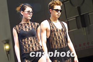 2004高級內衣流行趨勢發布會三月二十二日晚在上海世貿商城舉行,男女模特展示一款網式情侶內衣。作者:湯彥俊