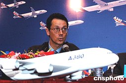 空中客車公司價格政策高級副總裁奧利維安德列斯,三月二十四日在北京介紹擁有555個座位的超大型飛機-A380飛機,并對中國市場前景極為樂觀。首架A380飛機今年五月開始總裝,二零零六年計劃投入運營。作者:王麗南