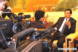 沈陽市長陳政高在北京人民大會堂接受記者采訪,介紹東北老工業基地經濟振興問題。中新社記者:王麗南