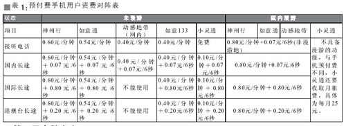 預付費用戶分未漫游(在北京市內使用)和漫游(在國內其他地區使用)兩類收費標準。具體資費標準見表1。