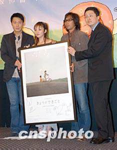4月8日,香港國際電影節(jié)本年邀得日本電影《日出前向青春告別》參展,該片女主角田中麗奈、導(dǎo)演行定勛(右二)向大會致送該片海報予以留念,電影節(jié)宣傳大使黎明代表大會接收。