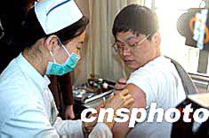 四月九日上午,福州市造血干細胞志愿捐獻者劉忠堅在福建腫瘤醫院接受干細胞動員劑注射。劉先生是在二月志愿獻血分型檢測時被發現與正在接受治療的福州李姓白血癥患者初配成功的。作者:鄭祚聲