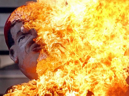 圖文:反對者在燃燒委內(nèi)瑞拉總統(tǒng)查韋斯的肖像