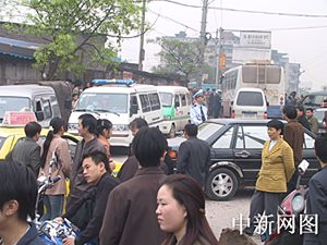 現(xiàn)場的工作人員基本上都戴著口罩,嚴陣以待。一名在廠門口值勤的警察告訴記者,他們已是今天第二批來這里的值勤的工作人員。