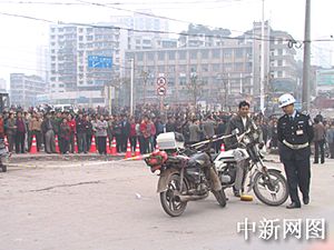 在距事故現(xiàn)場約三公里的地方,各主要交通干道已經(jīng)設置了路障,不允許車輛進入。在離化工廠約兩公里處,醒目的警戒線已經(jīng)攔住了公路,數(shù)十名警察正在幫助附近的居民疏散。