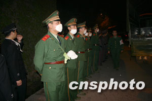 戴著口罩的武警戰士整齊列隊等待命令。十五日晚,重慶天原化工總廠發生氯氣泄漏事故,有十五萬人撤離。作者:鄒輝
