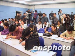圖為情況通報會現場緊張忙碌的記者們。作者:郭晉嘉 范卉