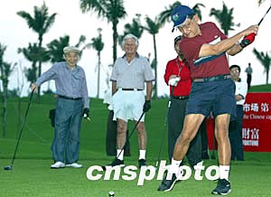 四月二十三日博螯論壇開幕在即,博鰲亞洲論壇理事長拉莫斯(右一)、澳大利亞前總理霍克(左二)、日本郵船株式會社名譽會長根本二郎(左一)共同為博鰲亞洲論壇高爾夫邀請賽開桿。中新社記者:鄭萍萍