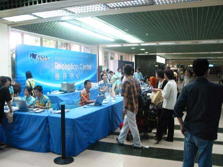 博鰲亞洲論壇2004年年會于4月24日在海南博鰲開幕。本次論壇年會主題為“亞洲尋求共嬴——一個對世界開放的亞洲”,表明2004年博鰲亞洲論壇年會將在全球背景下,探討亞洲各國和地區(qū)區(qū)域經(jīng)濟合作問題,尋求亞洲共同進步的有效途徑。圖為忙碌的海口美蘭機場博鰲亞洲論壇年會接待處。(春風)
