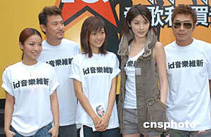 歌星許志安、陳慧琳、董敏莉、張學友、鄭融(右起)4月28日在香港商業電臺出席《id音樂維新》記者會,眾星百忙中出席活動,目的齊心呼吁大家支持正版音樂。作者:鄧慶樂