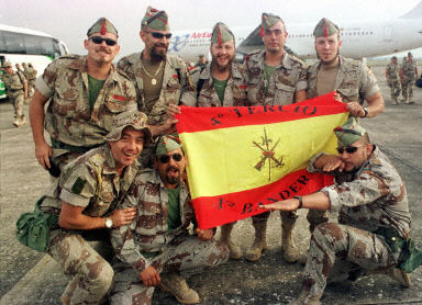 4月28日,248名西班牙最后一批駐伊作戰士兵乘飛機從科威特回國。圖為駐伊拉克的西班牙士兵到達西班牙西南部的Badajoz后與一面軍旗合影。