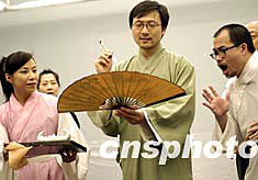香港話劇團2004/05年春夏劇第一炮《桃花扇》,四月二十九日舉行宣傳活動,該劇將于五月中旬在在香港大會堂劇院上演,圖為香港話劇團藝術總監毛俊輝為該劇造勢。 作者:錢興強
