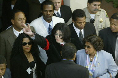 面對大批前來聲援與支持的歌迷,杰克遜僅向群眾揮揮手便快步進入法院。與上次出庭不同的是,杰克遜今天神輕相當輕松自在,不時露出微笑。雖然仍然有助理在旁亦步亦趨為他撐著黑傘,但杰克遜當天并沒戴著“招牌形象”的墨鏡,而是一般眼鏡。