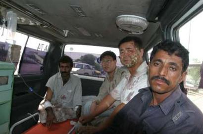 受傷的中國工人被送往醫院(REUTERS/Athar Hussain)