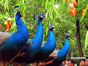 動物大巡游,是山東濟南動物園“五·一”黃金周的主打節目,豐富的表演形式,眾多的動物種類,讓游客大飽眼福。2004年5月3日,讓人喜愛的藍孔雀站在巡游花車上傲氣十足。希牛 攝