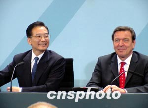 正在德國訪問的中國總理溫家寶三日下午和德國總理施羅德進(jìn)行會談,并發(fā)表了中德聯(lián)合聲明。圖為兩國總理在會談后聯(lián)合舉行記者招待會。作者:蔚中