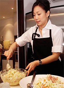 在短短半小時的烹飪示范時間里,她做了三道菜:媽媽的馬鈴薯沙拉、雪菜肉絲年糕湯,以及父親的酒釀丸子。