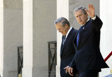 布什稱贊拉氏說,拉姆斯菲爾德在美國進行的反恐戰爭中領導有方,他的表現杰出,是強有力的國防部長,當得起美國人民的感謝。
