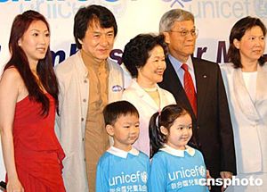 昨午于記者會上,成龍也將經歷跟一眾分享,而聯合國兒童基金香港委員會副主席陳方安生昨日亦特頒授紀念品予成龍。