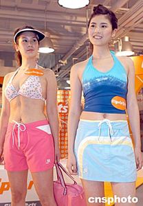 樂壇新星官恩娜(右)、歌星陳見飛5月12日在香港出席全港最大的運動專門店GigaSports SuperStore開幕,兩人客串模特展示最新泳裝。